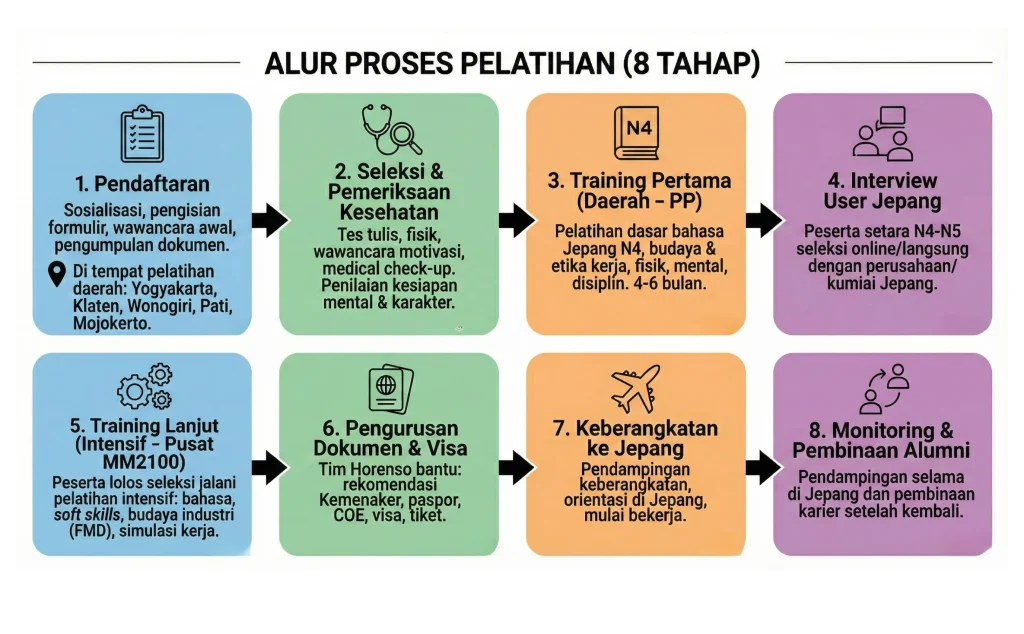 Dari seleksi, pelatihan, keberangkatan, monitoring di Jepang, hingga pembinaan karier setelah pulang.