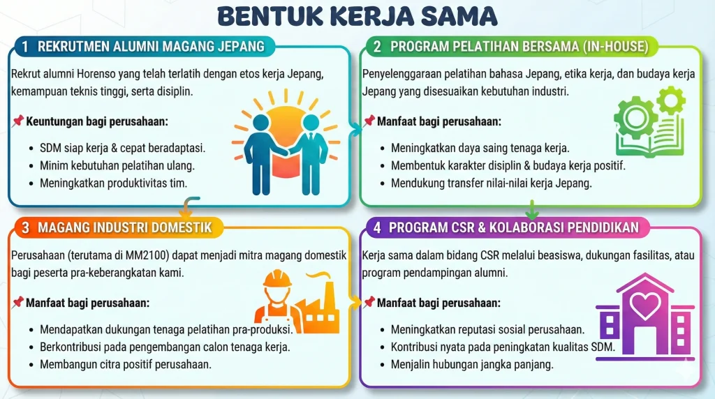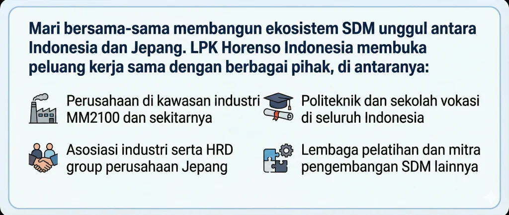 Harapan kami sederhana namun besar: para peserta bukan hanya sukses bekerja di Jepang, tetapi juga kembali sebagai tenaga ahli, pemimpin masa depan, dan kontributor penting bagi perusahaan-perusahaan di kawasan MM2100 serta industri nasional. Horenso Indonesia hadir untuk membentuk SDM berkarakter, berkompetensi global, dan berjiwa nasional.