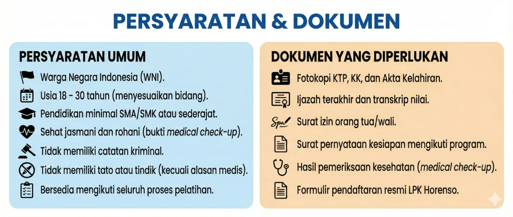 Untuk mengikuti program pelatihan dan penempatan ke Jepang, peserta wajib memenuhi beberapa ketentuan dasar berikut: